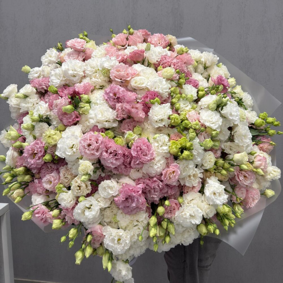 На фото букет из 101 эустомы розового и белого цвета. В составе: эустома (лизиантус) 101 шт, дизайнерская упаковка 5 шт, атласная лента 1 шт, . Все цветы свежие и ароматные, букет красиво оформлен и отлично подходит для подарка. Доступна доставка цветов или самовывоз.