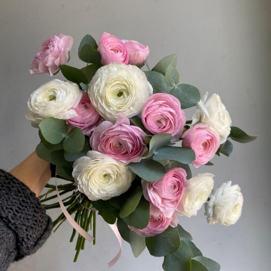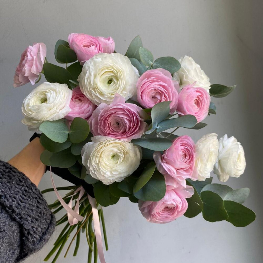 На фото 15 белых и розовых ранункулюсов. В составе: ранункулюс 15 шт, эвкалипт 2 шт, атласная лента 1 шт, . Все цветы свежие и ароматные, букет красиво оформлен и отлично подходит для подарка. Доступна доставка цветов или самовывоз.