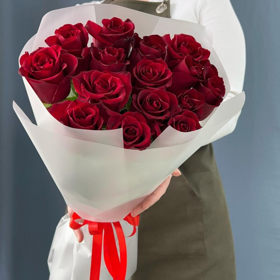 На фото букет из 15 бордовых роз. В составе: роза 15 шт, дизайнерская упаковка 1 шт, атласная лента 1 шт, . Все цветы свежие и ароматные, букет красиво оформлен и отлично подходит для подарка. Доступна доставка цветов или самовывоз.