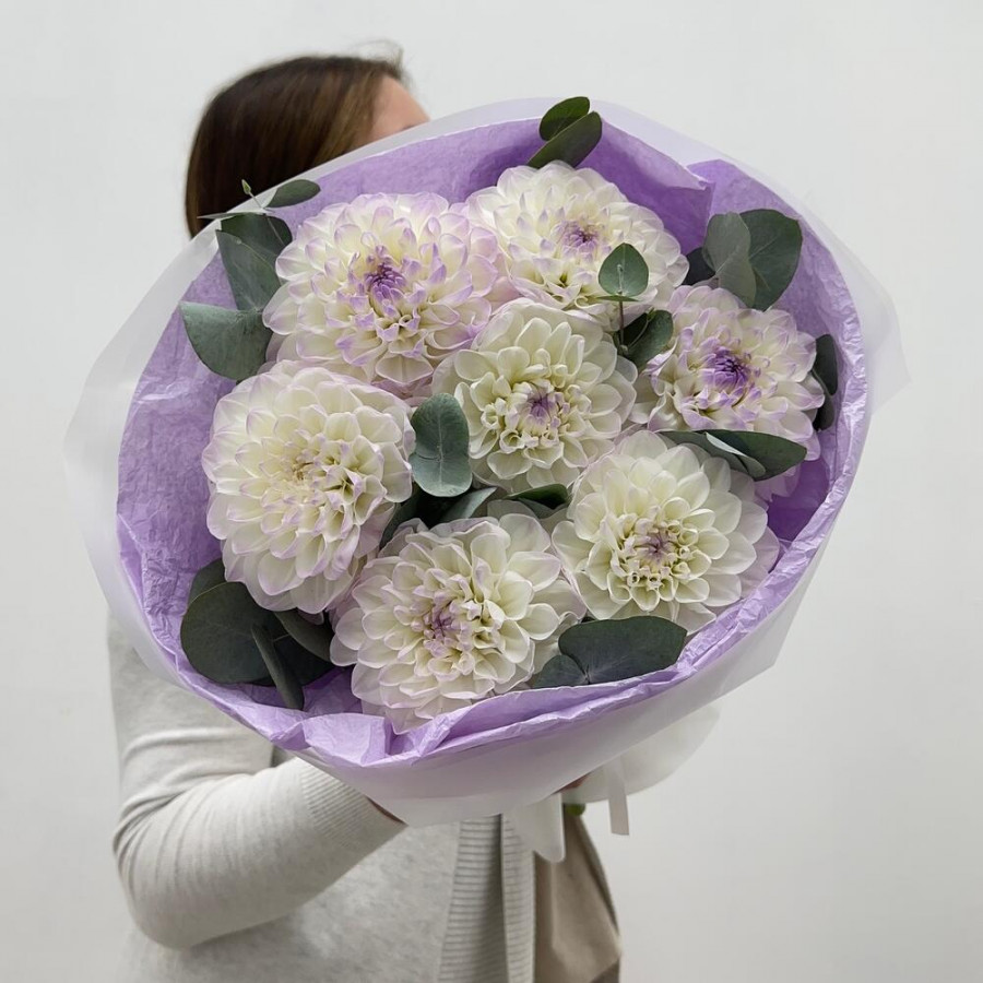 Букет из 7 бело-лиловых георгин с эвкалиптом в Кузнецке
