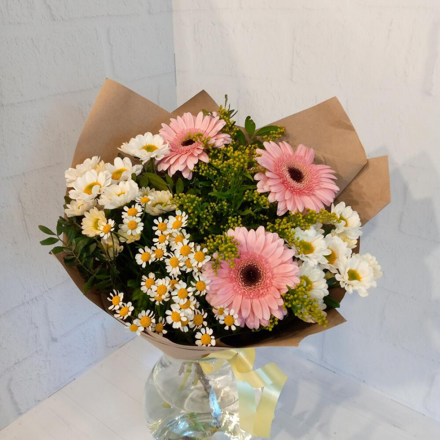 На фото букет «дачное настроение». В составе: гербера 3 шт, хризантема кустовая 2 шт, танацетум 1 шт, солидаго 2 шт, дизайнерская упаковка 1 шт, атласная лента 1 шт, . Все цветы свежие и ароматные, букет красиво оформлен и отлично подходит для подарка. Доступна доставка цветов или самовывоз.