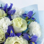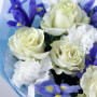 Букет из белых гвоздик, синих ирисов и белых роз в Кузнецке