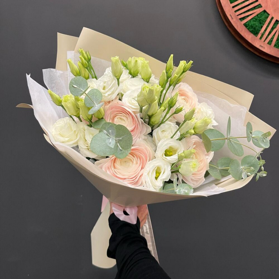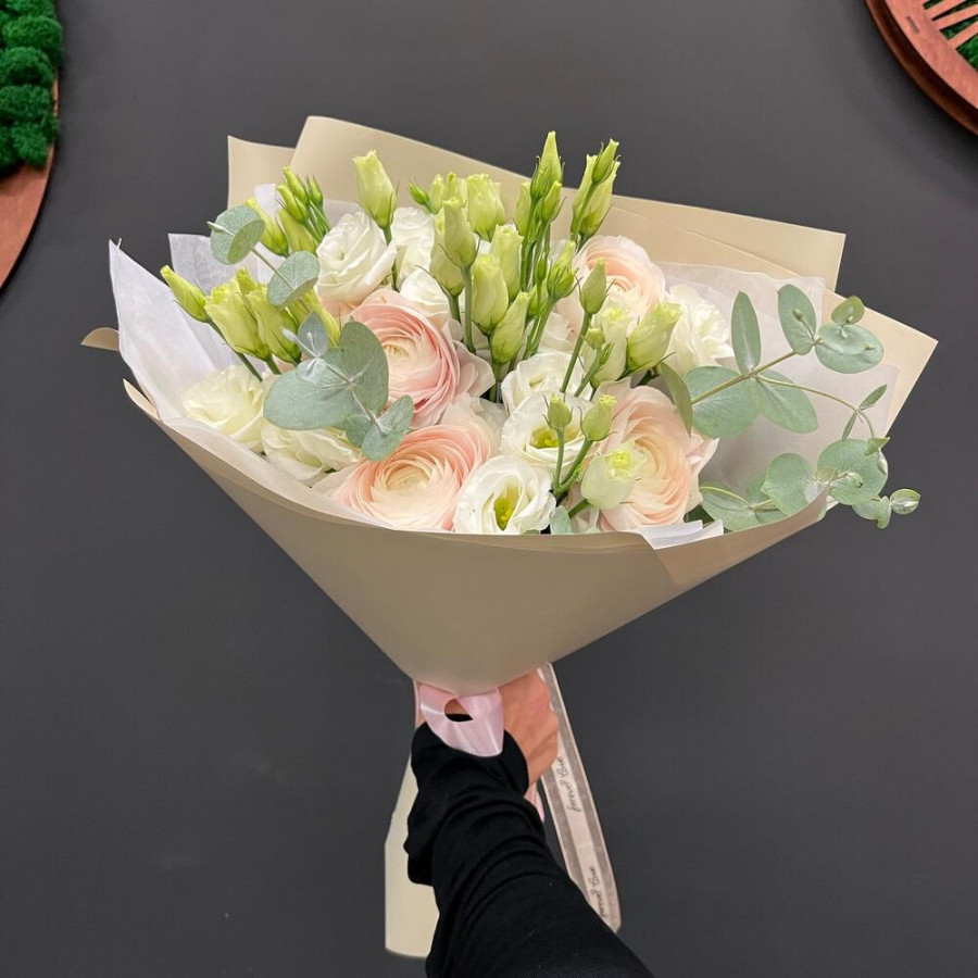 На фото букет из эустом и ранункулюсов. В составе: эустома (лизиантус) 4 шт, ранункулюс 5 шт, эвкалипт 3 шт, дизайнерская упаковка 1 шт, атласная лента 1 шт, . Все цветы свежие и ароматные, букет красиво оформлен и отлично подходит для подарка. Доступна доставка цветов или самовывоз.