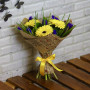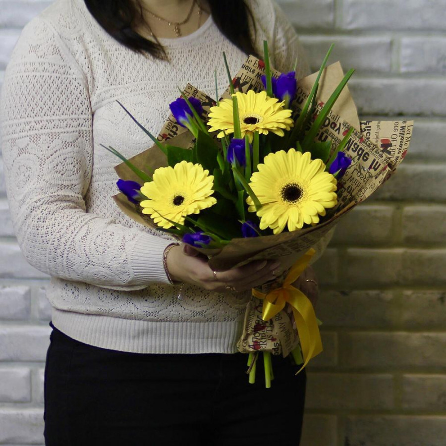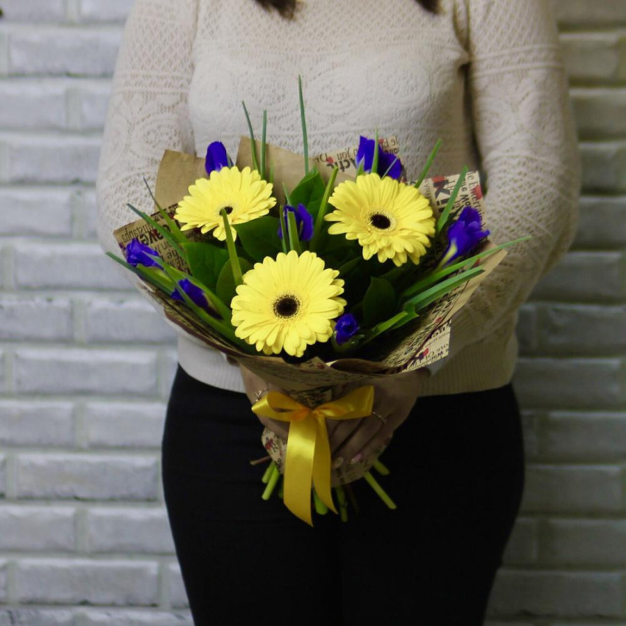 Букет из желтых гербер с синими ирисами в Кузнецке
