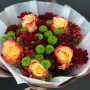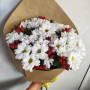 На фото букет из хризантем и гиперикума. В составе: хризантема кустовая 5 шт, гиперикум 3 шт, роза 5 шт, крафт-бумага 1 шт, атласная лента 1 шт, . Все цветы свежие и ароматные, букет красиво оформлен и отлично подходит для подарка. Доступна доставка цветов или самовывоз.