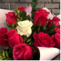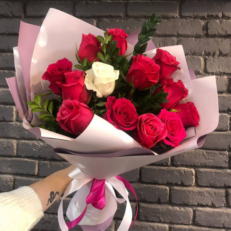 На фото букет из красных роз с зеленью. В составе: роза 13 шт, писташ 2 шт, крафт-бумага 1 шт, атласная лента 1 шт, . Все цветы свежие и ароматные, букет красиво оформлен и отлично подходит для подарка. Доступна доставка цветов или самовывоз.