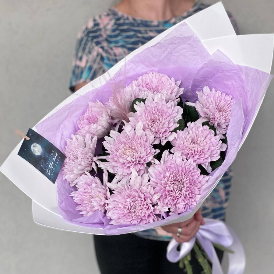 На фото букет из розовых одноголовых хризантем. В составе: хризантема одноголовая 11 шт, крафт-бумага 1 шт, . Все цветы свежие и ароматные, букет красиво оформлен и отлично подходит для подарка. Доступна доставка цветов или самовывоз.