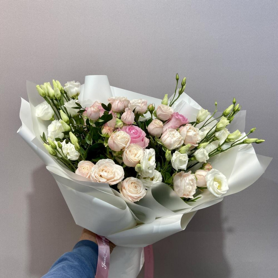 На фото букет из пионовидных роз и белых эустом. В составе: эустома (лизиантус) 3 шт, роза 3 шт, кустовая пионовидная роза 3 шт, писташ 7 шт, дизайнерская упаковка 1 шт, атласная лента 1 шт, . Все цветы свежие и ароматные, букет красиво оформлен и отлично подходит для подарка. Доступна доставка цветов или самовывоз.