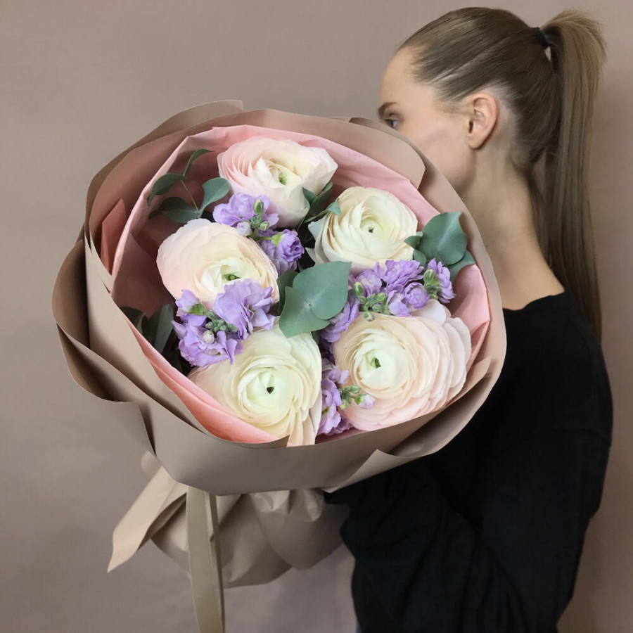 Букет из розовых ранункулюсов и сиреневой матиолы в Кузнецке